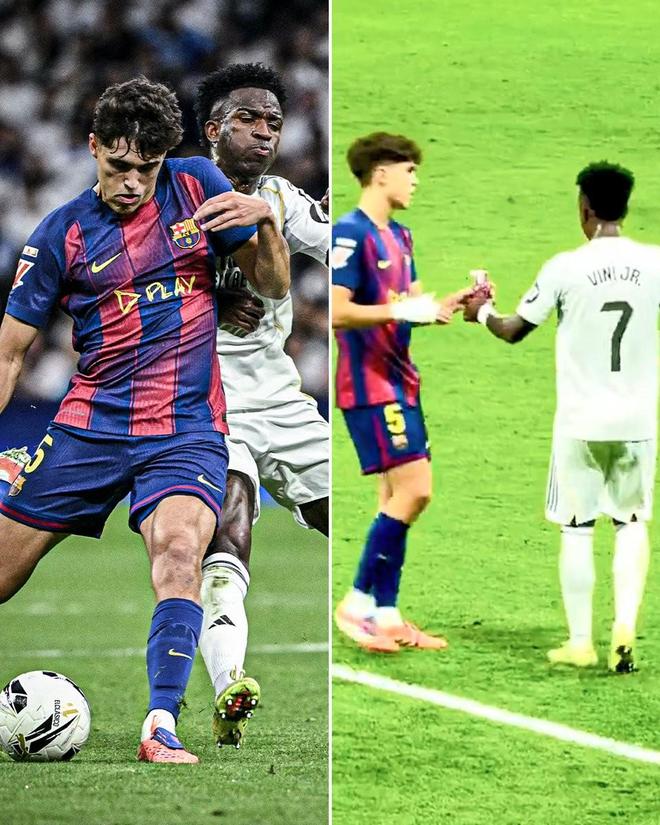 尽管上周末的西班牙国家德比在场外和场内都出现了冲突,但场上也有友好的一幕,皇马前锋维尼修斯和巴萨后卫库巴西在比赛期间曾共喝一瓶水。